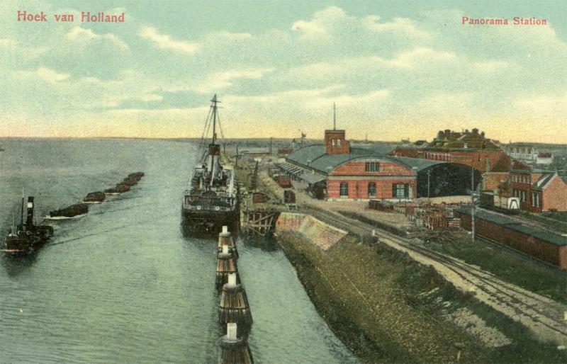 Een overzichtsbeeld van station Hoek van Holland aan het begin van de vorige eeuw. Prentbriefkaart, collectie SNR.