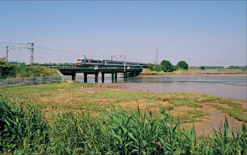 Een IC Norwich–Londen passeert de getijderivier Stour bij Manningtree. De locomotief is de 90009 ‘Diamond Jubilee’ ter ere van het jubileum in 2012 van Queen Elizabeth II; 6 juli 2013. Foto: Michiel van Ballegoijen de Jong.
