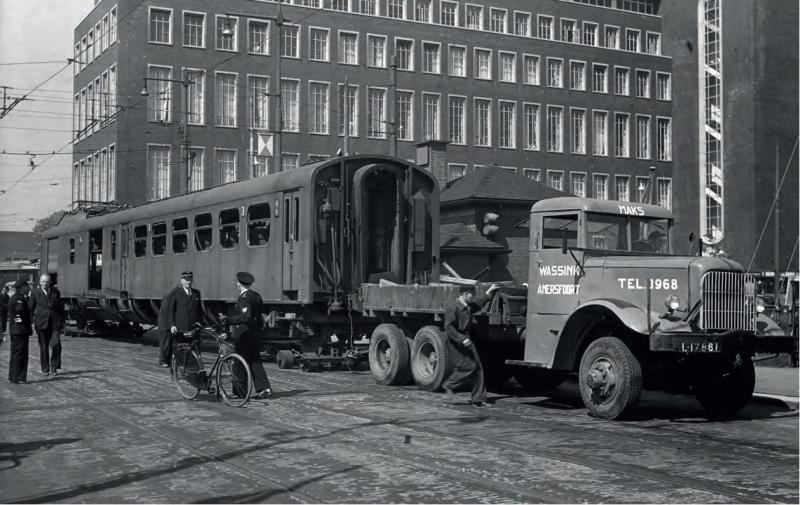 De CD 315 passeert onderweg naar ‘Rotterdam Ahoy’ de Puntegaalstraat. Op de achtergrond het in 1948 geopende en sinds 1996 niet meer als zodanig gebruikte belastingkantoor. Foto: NS; collectie Het Utrechts Archief.