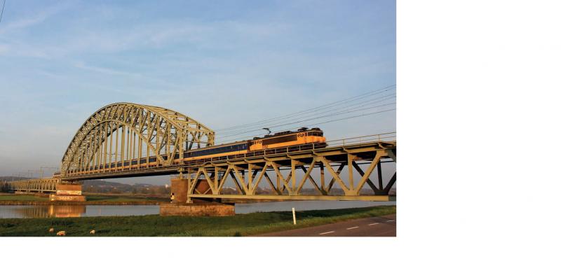 De trek-duwstammen ICR met locomotief serie 1700 behoren weldra tot het verleden. De 1752 met een zevenwagenstam onderweg als trein 3659 van Zwolle naar Roosendaal snelt over de Rijnbrug bij Arnhem; 28 oktober 2014. Foto: Peter Boere.