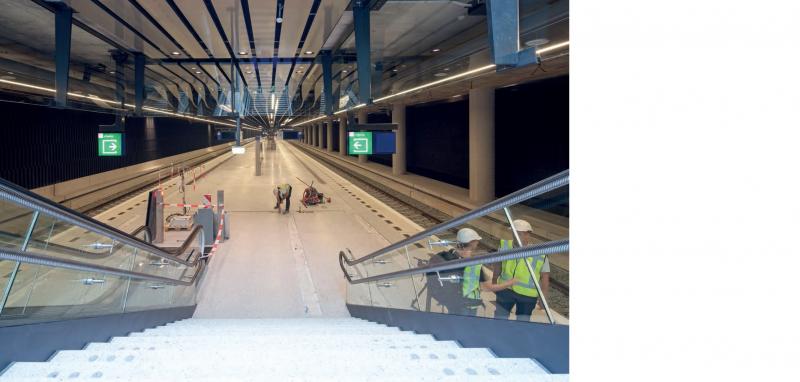 Een blik in de nieuwe spoortunnel in Delft die op 28 februari in gebruik wordt genomen. Het nieuwe, oostelijke perron gezien in noordelijke richting; 18 september 2014.Foto: Huib Nederhof.