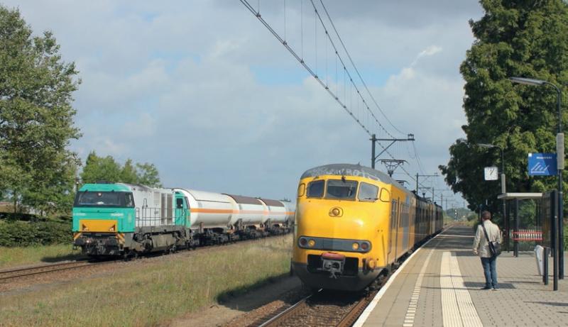 NS-stoptreinen ten zuiden van Weert zijn binnenkort historie, net als het hier nog vaak ingezette mat’64.Op 11 september 2013 vertrekken de treinstellen 469 en 443 uit Geleen-Lutterade naar Maastricht Randwyck en passeert links een G2000-locomotief van Rotterdam Railfeeding. Foto: Ronnie Beijers.