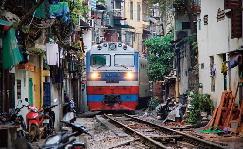 Nog altijd persen treinen – hier locomotief D19E 926 met rijtuigen – zich door de oude binnenstad van Hanoi; 9 januari 2013. Foto: verzameling Henry van Amstel.