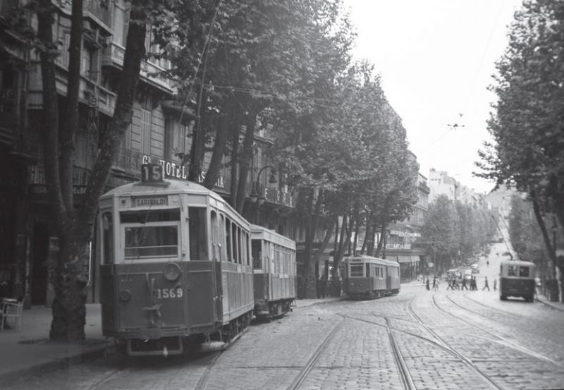 De Boulevard Garibaldi in Marseille, kenmerkend stadseindpunt van de lijnen 15 en 18 met de trekduwstellen 1569 + 102 en 75 + 1614; 23 september 1950. Foto: J. van Diggelen.