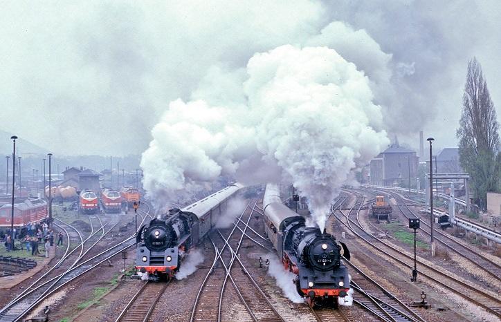 Op 30 april 1991 vond in Saalfeld het ‘dubbelvertrek’ plaats van 01 1531 met E 802 van Sonneberg naar Leipzig en 41 1231 met D 504 van Saalfeld naar Berlijn. Het drie uur voor vertrek innemen van de fotolocatie werd beloond. Op het moment van vertrek stonden naar schatting meer dan 200 fotografen op de brug. Foto: Bart van ’t Grunewold.