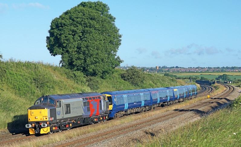 De 37800 van Rail Operations Group brengt op 2 juli 2016 een pas gemoderniseerd voor Southeastern bestemd Electrostar-treinstel van Derby naar Ramsgate, hier ter hoogte van Irchester. Foto: Ian Leech.