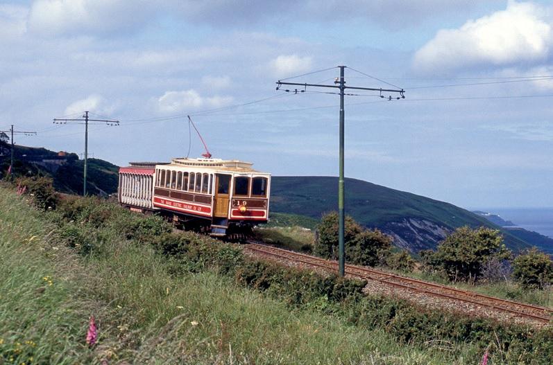 Op het eiland Man vinden we trams die meer dan een eeuw oud zijn, zoals motorwagen 19 en bijwagen 46, beide uit 1899. Tussen Laxey en Bulgham Bay ligt de tramlijn direct naast de Ierse Zee; 6 juli 1993. Foto: Marco Moerland.