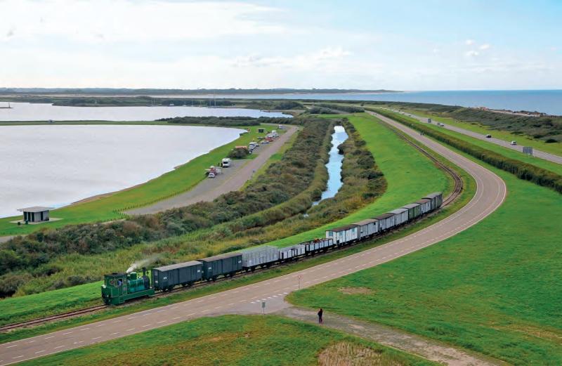 Zicht op de dam, het Grevelingenmeer (links) en de Noordzee. Het RTM-museum kan als een van de weinige railmusea in Nederland een representatieve goederentram op de baan brengen; 27 september 2015.Foto: Marco Moerland.