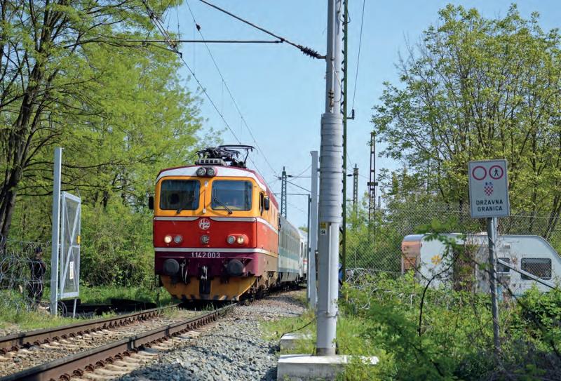 Trein IC 200 ‘Agram’ van Budapest naar Zagreb, bestaande uit twee rijtuigen, passeert op 23 april 2016 het Hongaarse grenshek kort na vertrek uit Gyékényes. De caravan rechts is het onderkomen van de grenswachten. In tegenstelling tot de Serviërs laat de Kroatische grenspolitie zich hier niet zien. Foto: John Krijgsman.