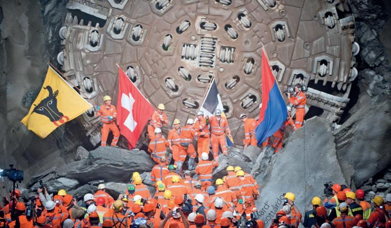 Na jarenlang boren vond op 15 oktober 2010 bij Sedrun de hoofddoorbraak plaats, wat gepaard ging met een groot feest. Foto: AlpTransit Gotthard AG.