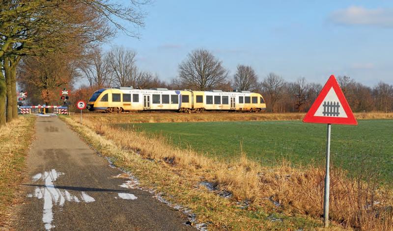 Syntus zette in de Achterhoek door Alstom gebouwde Lint 41- dieseltreinstellen in. Op 4 februari 2012 pendelde treinstel 29 tussen Zutphen en Winterswijk en passeerde een landelijke overweg bij Lievelde. Foto: Frans Blanker.