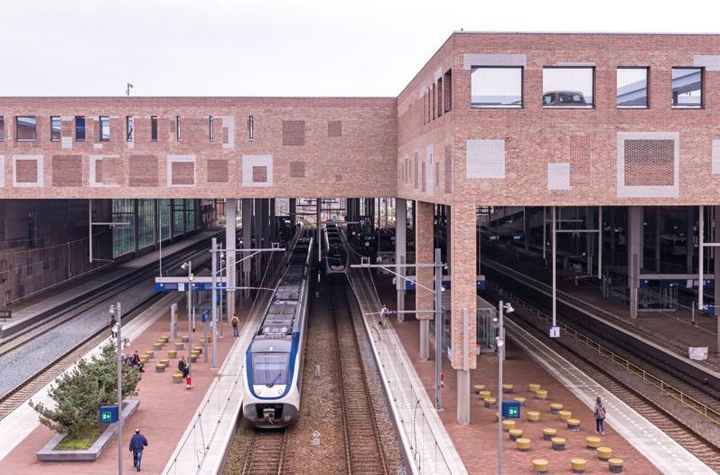 Het nieuwe station gezien van de tijdelijke loopbrug op3 juni 2016. Goed zichtbaar zijn de open inrichting van de perrons en het gevarieerde metselwerk. Foto: Remco Bruggink.