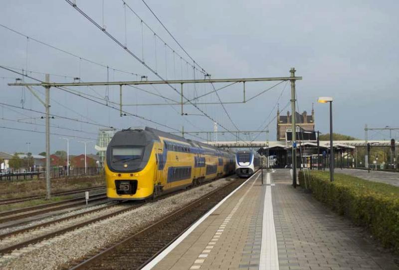 Geldermalsen zal worden verbouwd als draaipuntin de tienminutendiensten die zowel intercity′s alssprinters gaan rijden. Intercity 3531 haalt hier op 25 oktober 2017 sprinter 6933 in. Foto: Kars Cleveringa.