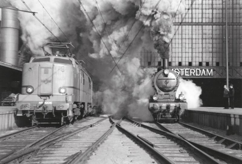 De instroom van nieuwe locomotieven betekent teruggang in de stoomtractie. De 3771 lijkt zich nog niet gewonnen te geven bij vertrek met de Scandinavie Expres uit Amsterdam CS. Links de 1206 met de Genua Expres; 18 februari 1952. Foto: L. Stigter.