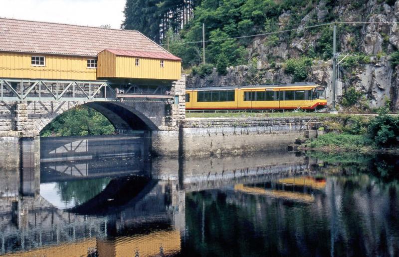 Op de rit naar Freudenstadt passeert een tram van lijn S41 de Murgtalsperre; 16 juli 2004. Foto: Maurits van den Toorn.