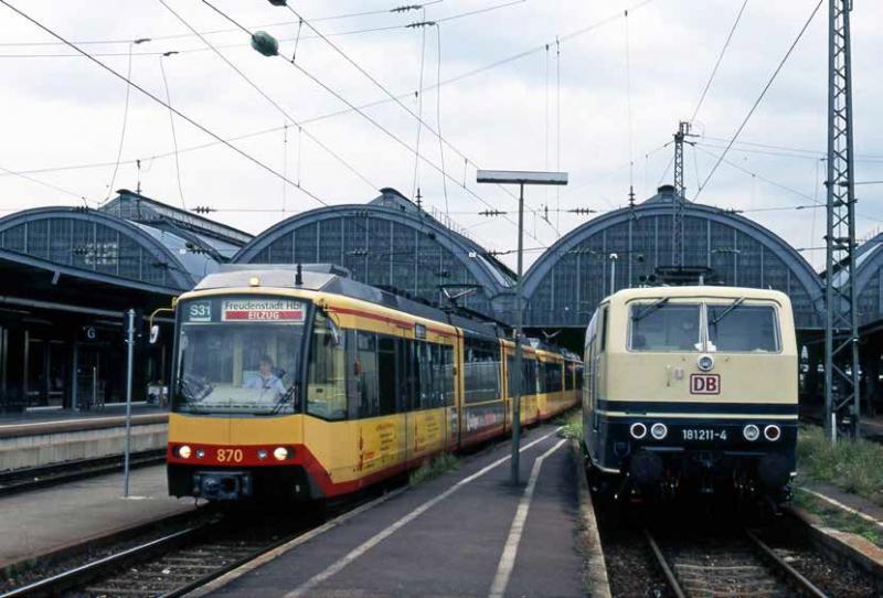 Karlsruhe Hauptbahnhof op 28 augustus 2006 met een vertrekkende S-Bahn naar Freudenstadt en DB-locomotief 181 211 die wacht op zijn volgende inzet voor een trein naar Straatsburg of Stuttgart, toen een van de werkterreinen van deze serie tweesysteemlocomotieven. Foto: Maurits van den Toorn.
