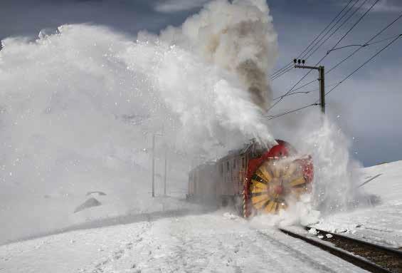 Schneeschleuder Xrot 9213 (bouwjaar 1910) van de Rhätische Bahn in actie op de Berninapas tussen Bernina Lagalb en Ospizio Bernina; 26 februari 2017. Voor de tractie zorgt museumlocomotief Ge 4/4 182 uit 1928. Foto: Georg Trüb.