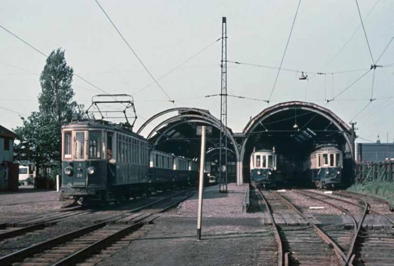 Het tramstation Amsterdam Noord met drie Métallurgique-motorwagens (waaronder de A26 en A25) en een aantal bijwagens. De middelste tram (met vlaggetjes) is de Marken Expres; 21 mei 1956. Fotograaf onbekend.