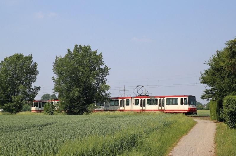 Echt landelijke trajecten zijn er in het Ruhrgebied nog maar weinig. Tussen Obernette en Westerfilde rijdt de Dortmundse lijn U47 een stukje door de korenvelden;29 mei 2018. Foto: Maurits van den Toorn.