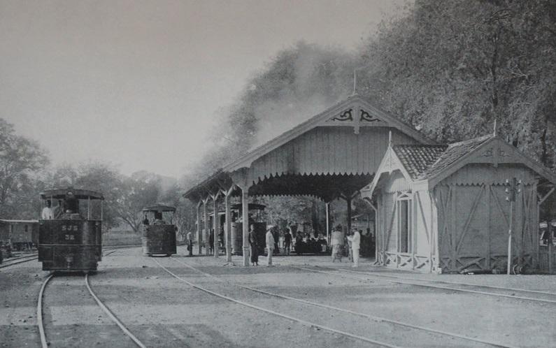 Poerwodadie was een knooppunt met trams in drie richtingen. Hier zijn de locomotieven 32, 23 en onder de kap een onbekend exemplaar te zien.Het station is nog gebouwd door de Poerwodadi-Goendih Stoomtram Maatschappij. Foto: Gedenkboek der Samarang-Joana Stoomtram Maatschappij, 1907.