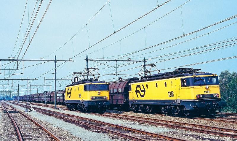 Het in 1968 ingevoerde NS-logo zal waarschijnlijk het meest prominent aanwezig zijn geweest op de gerenoveerde locomotieven serie 1300 en het CTO-meetrijtuig. De 1309 wordt op Rotterdam Noord Goederen voorbij gereden door de 1316 met een lege zouttrein uit Hengelo; 6 augustus 1989. Foto: Bart van ’t Grunewold.