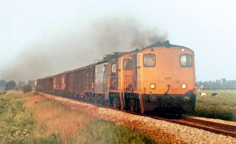 In juni 1977 verduistert een setje 2200’en de omgeving als ze met een 1300 in opzending op weg zijn naar Leeuwarden, hier gefotografeerd bij Ouddeel. De trein met schuifwandwagens is niet bijster lang, maar twee diesels zijn nodig om snelheid te kunnen houden op de nu zo drukke diesellijn. Vanaf Leeuwarden zal de 1300 de trein uit Delzijl verder vervoeren naar Amersfoort. Foto: Jan Weima.