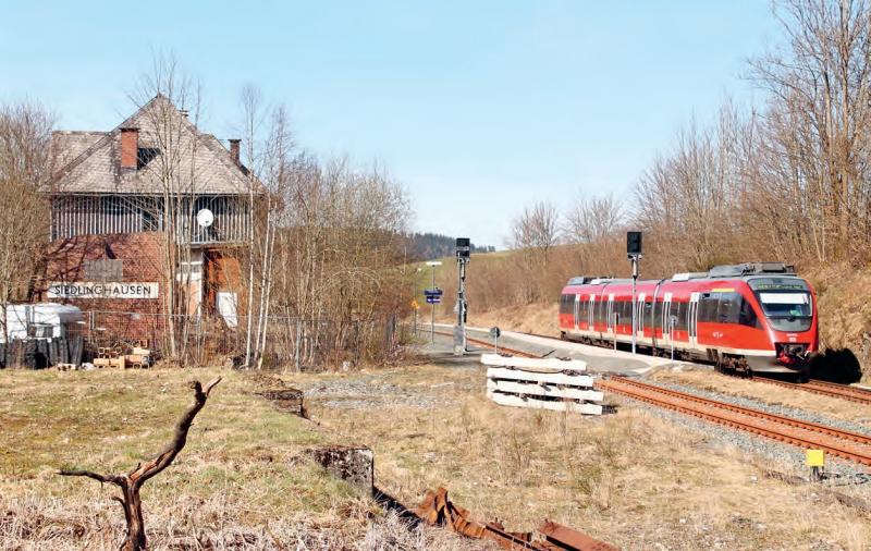 DB Regio-Talent 644 034 komt aan bij de Bedarfshaltestelle Siedlinghausen. Het station, buiten het dorp op een heuvel, is helaas in verval. De trein is net in Winterberg begonnen aan de rit naar Dortmund; 7 april 2018. Foto: Daniël van der Winden.