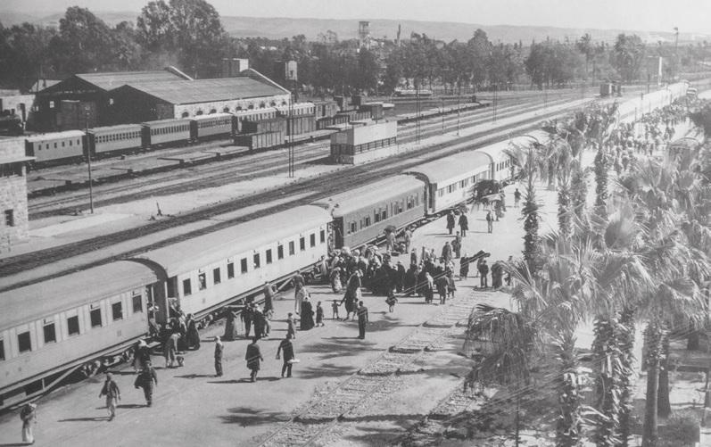 Haifa East station in 1945. Passagiers maken aanstalten in te stappen in de trein met eindbestemming Cairo.Op de achtergrond zijn de werkplaatsen van de Hedjaz-spoorlijn zichtbaar. Foto: collectie Israëlisch spoorwegmuseum.