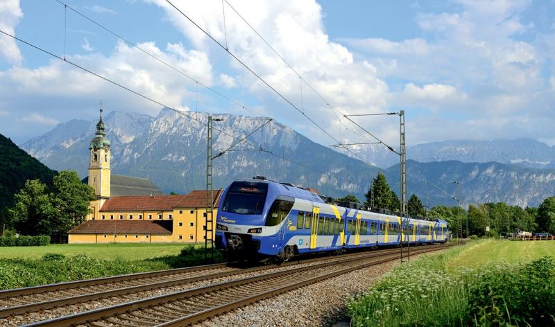 De eerste Flirt 3-treinstellen waren voor Meridian. ET 323 naar München bij Niederaudorf; 25 mei 2014.Foto: Christoph Schneider.