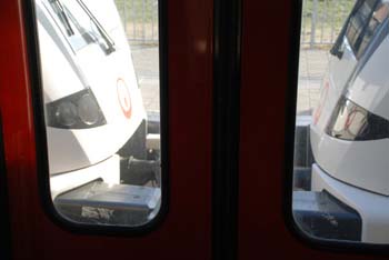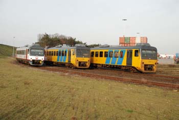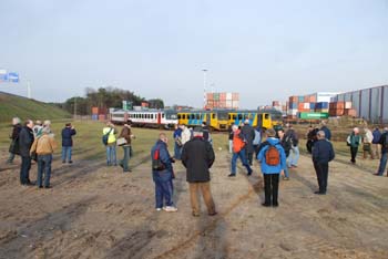 Dát heeft zich nu herhaald. Nadat de heenrit naar Roermond, onderbroken door enkele fotostops en met een ritje over de goederensporen van het emplacement Venlo, voorspoedig was verlopen werd na de pauze in Roermond via Tegelen naar Blerick gereden. Hier wachtte een verrassing voor de deelnemers: er was een fotostop georganiseerd voor het depot van de Containerterminal waarbij de DH-stellen in een line-up voor de fotografen werden geplaatst, dankzij het zonnige weer konden er veel mooie opnamen worden gemaakt. Er was wel enig gemurmel onder de deelnemers (“die groene had er ook bij moeten zijn”, “waar is de fiets-DH nu?“, etc.), maar achteraf bleek er volop waardering voor de organisatoren van deze excursie en het Veolia-personeel dat voor de begeleiding en uitvoering hiervan heeft gezorgd.