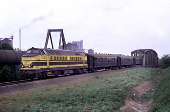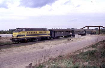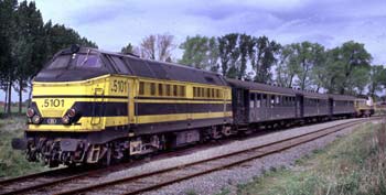 Voorgesorteerd voor rechtsaf naar beneden stond onze museumtrein (de tijdloos fraai gelijnde 5101 met drie A’s van het type K1) aangekondigd als een X-trein naar Gent. Terwijl wij dus feitelijk net niet in Antwerpen zélf vertrokken was het evenmin de bedoeling om in Gent zelve toe te komen. Dat was een verrassing voor één verongelijkte Nederlandse toerist, die er in Sint-Niklaas gauw uitgeholpen werd. Bevrijd van deze confrontatie met het gewone bestaan brachten de SNE-mensen vervolgens het uiteindelijke reisschema voorzien van duidelijke kaartjes rond. De lijnenspaghetti op de kaart in de buurt van Gent vormde een schril contrast met het vrijwel kaarsrechte traject waarover we vervoerd werden tot vlak voor het grote goederenstation Gent Zeehaven. Daar zijn we die dag meermalen even geweest en dan werd onze rijdende tribune bij de rangeerheuvel zó neergezet dat we er nog van het heuvelen hebben kunnen genieten terwijl er weer eens kopgemaakt werd. In Zeehaven werd in verband met de diverse uitstapjes een 7700 achteraan bijgeplaatst, zodat we overal steeds gemakkelijk weer kop konden maken. Die reeks 77 ziet er uit als een wat heftiger variant op een 6400. Iets langer en met een aantrekkelijk kleurenschema (zie OdR 2003-5, pag. 180).