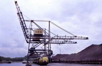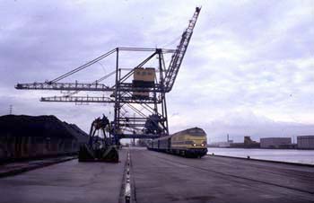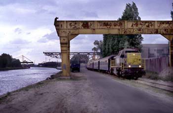 Na deze mijmeringen over verleden en toekomst ronkten wij weer verder (terug) langs een wel erg uit het verleden overgebleven stationsruïne bij Doornzele in de buurt om dichter bij Gent wéér een keer kop te maken op het inhaalspoor van Wondelgem, nu om de zuidelijke oever van het eerder aan de andere kant bezochte Kanaal van Gent naar Oostende te bezoeken. Daarhéén werd ons geen duimbreed in de weg gelegd – al staken de boomtakken wel heel enthousiast de trein in – maar op de terugweg hing er zomaar ineens een veertig meter lange stalen balk dwars door het profiel van vrije ruimte. Het zou trouwens een slecht moment geweest zijn om de trein in een cabrioletmodel te veranderen, want het was net heel licht gaan regenen. De balk werd weggehesen zodat wij weer verder konden op weg naar huis, pardon, Gent Zeehaven, waarna er nog tijd over was voor een extra slag naar een kolenhaven, waar onze trein wel een schaalmodel leek midden onder een van de enorme overslagkranen die daar over het spoor staan.