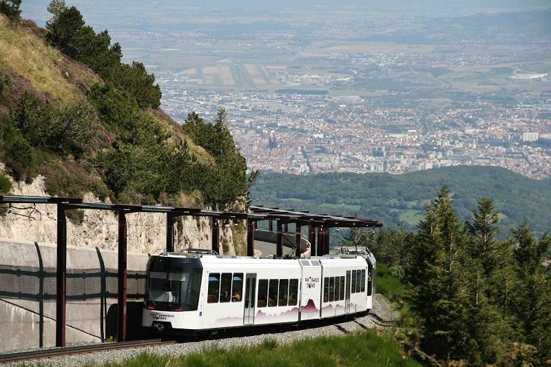 De nieuwe tandradlijn naar de top van de Puy de Dôme, met op de achtergrond Clermond-Ferand op 2 september 2014. Foto: Karel Koploper.