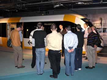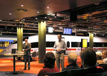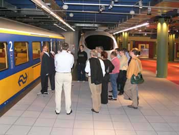 De spoorwegen gunden de deelnemers een kijkje in de keuken; NS Trefpunt – een soort showroom – in hoofdgebouw IV vormde een passend decor. Te midden van mock-ups van een ICE, een vernieuwde Sprinter en een gereviseerd Intercity-rijtuig werd een bedrijfspresentatie gegeven, waarbij onder meer het vak van conducteur en machinist werd belicht. Verder werden de werking van de chipkaart en de elektronische toegangspoortjes, die nog dit voorjaar in de regio Rotterdam in de praktijk worden beproefd, uit de doeken gedaan. De deelnemers lieten zich – met soms kritische vragen – niet onbetuigd.
