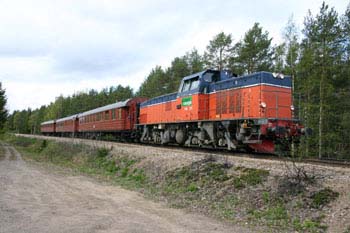 Terwijl groep A (36 deelnemers) van Finland naar Zweden treint, reist groep B (45 deelnemers) in tegengestelde richting. De Zweedse tractie bestaat uit een diesellocomotief T44 met drie rijtuigen, terwijl op het Finse breedspoor twee gekoppelde dieselmotorwagens Dm7 voor ons worden ingezet. De motorwagens brengen beide groepen tot over de poolcirkel naar Kelloselkä, niet ver van de Russische grens. Het baanvak is bedreigd, dus het zou wel eens de laatste keer geweest kunnen zijn… In Noord-Zweden wordt nog meer materieel gehuurd; met een elektrisch tweewagenstel X21 gaat het van Stockholm naar Luleå en na een dag rust met de andere groep weer terug naar Gävle, waarbij een aantal dwarsverbindingen naar de kust wordt meegenomen. Reizigersvervoer vindt op de noord-zuidlijn nauwelijks plaats: er rijden slechts twee doorgaande nachttreinen. Wel krijgt het goederenvervoer hier ruim baan; menigmaal moet onze trein dan ook aan de kant voor een kruising. De natuur in het hoge noorden is overweldigend, maar na een paar dagen van bossen en meren, nog meer bossen en nog meer meren raakt zelfs de ware liefhebber enigszins verzadigd.