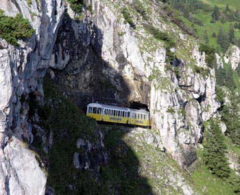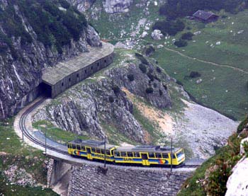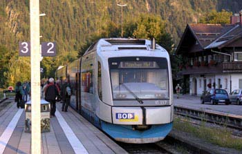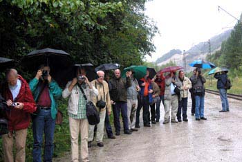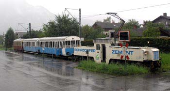 De derde en wellicht meest interessante dag ging het richting de grens met Oostenrijk. Allereerst met een DB-trein naar Rosenheim en vandaar met de ÖBB naar Kiefersfelden, waar we na een korte (maar zeer natte!) wandeling aankwamen bij de Wachtlbahn. Hier bracht een excursietrein met klassieke rijtuigen en krokodil-achtige tractie ons naar het bergstation, waarvandaan normaal gesproken kalksteen wordt vervoerd. Terug in het dorp stonden na een goede lunch twee bussen klaar om ons naar het dalstation van de Wendelsteinbahn te brengen in het nabij gelegen Brannenburg. Met de laatste dienstregelingstrein van de dag gingen we omhoog over deze mooie tandradbaan. Eenmaal boven konden we genieten van het aanvankelijk beperkte uitzicht of even een stevig wandelingetje maken. Met uitzicht over het dal genoten we vervolgens van een vroeg diner, waarna we per Nostalgiezug de rit naar beneden aanvingen. Daar stonden de twee bussen weer klaar om ons via de schitterende Alpenstraße naar Bayerischzell te vervoeren, waar één van de takken van de BOB begint. Rond acht uur vertrokken we hiervandaan weer richting München, begeleid door een aantal aangeschoten dames die hun vrijgezellenfeest (met ons) vierden. Een deel van de groep is onderweg in Holzkirchen uitgestapt om een daar tijdelijk gestationeerd TEE-stel te bezichtigen, dat nu als restaurant in gebruik is.