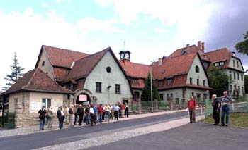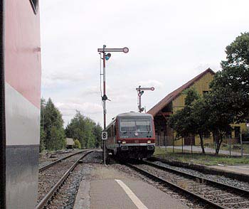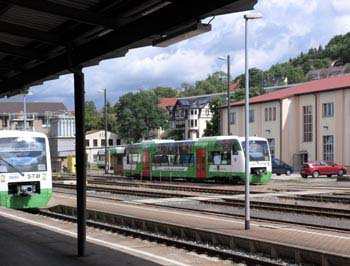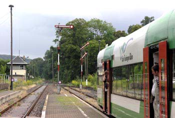 Op 7 augustus 2008 moesten velen voor dag en dauw van huis vertrekken om op tijd in Enschede te zijn. Deze dag zouden we per Regionalbahn en -Express richting het oosten trekken. Uit Enschede vertrokken we om 9.26 uur met 72 passagiers, om allereerst per DB-Talent richting Münster te boemelen. Na een ruime overstap zagen we al stoppend het landschap veranderen in glooiende heuvels en vakwerkhuisjes. Deze trein bracht ons tot Warburg, waarna we dieselend Kassel bereikten. Hiervandaan ging het verder per Cantus-trein via Bebra naar Eisenach, waarbij ter hoogte van Gerstungen de grens met de voormalige DDR enige malen werd gepasseerd. De tekenen hiervan zijn nog steeds zichtbaar. De liefhebbers van de echte ‘Nebenbahnen’ konden vanaf Eisenach hun hart ophalen, toen het per STB over de Werrabahn verder ging naar de eindbestemming Meiningen. In dit mooie stadje sliep een groot gedeelte van de groep in de plaatselijke gevangenis, die voor de gelegenheid was verbouwd tot een trendy hotel. ’s Avonds hebben we boven in de gevangenis gedineerd, waarbij het eten het niveau van water en brood ver ontsteeg.