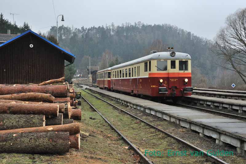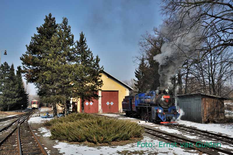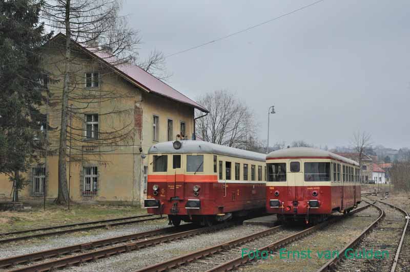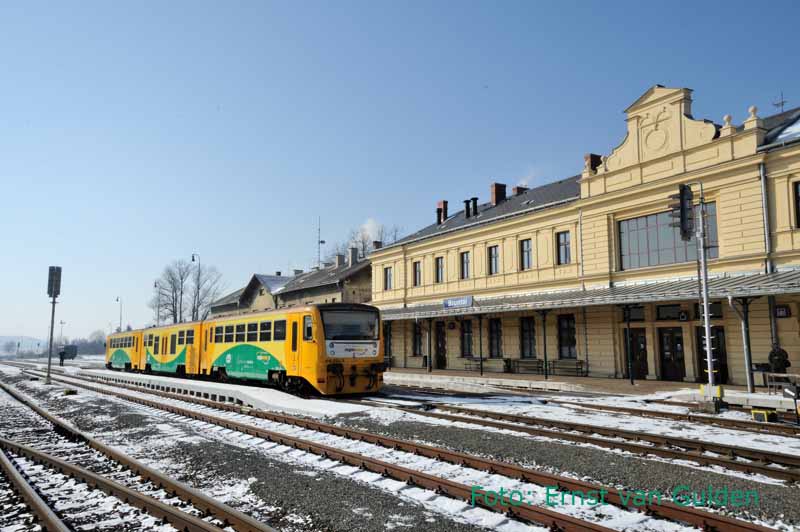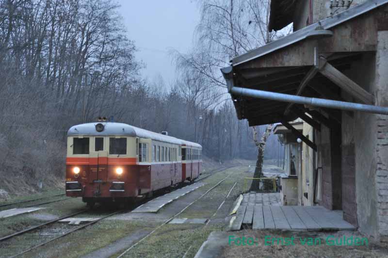Inmiddels stilgelegd is de lijn Bosice – Becvary. Met zeer veel moeite mocht de NVBS deze route nog berijden. De trein staat hier in het kopstation halverwege de lijn: Zasmuky, 18 februari 2011. Foto: Ernst van Gulden.
