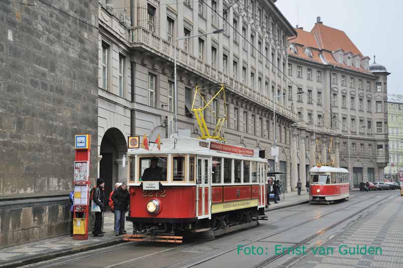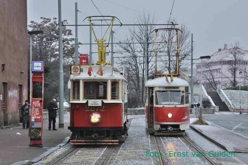 Het eerste deel van de rondrit door Praag werd met de motorwagens 2272 (gebouwd door Ringhoffer in 1930) en 5002 (T1-motorwagen gebouwd door Tatra in 1952) gereden. Praag Jindrisska, 19 februari 2011. Foto: Ernst van Gulden.