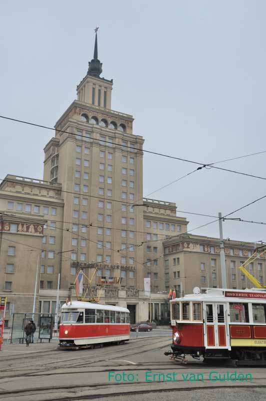 De beide excursiemotorwagen voor het grootste Stalinistische gebouw in Tsjechië, Hotel Crowne Plaza uit 1954 (eerder: Hotel Druzba, Hotel Cedok, Hotel International and Hotel Holiday Inn) in Praag. 18 februari 2011. Foto: Ernst van Gulden.