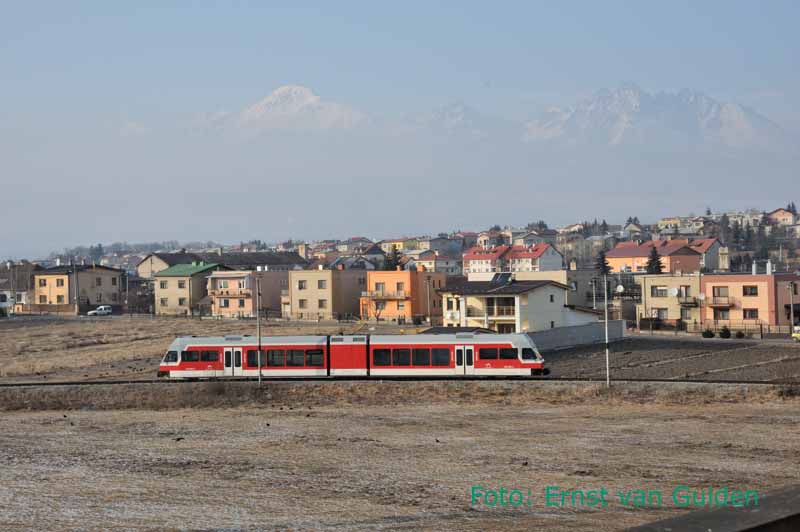 ZSSK motorwagen 425.960-2 rijdt, met op de achtergrond de Hoge Tatra, van het depot in Poprad naar het station Poprad-Tatry. 21 februari 2011. Foto: Ernst van Gulden.