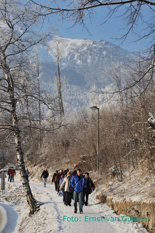 De groep wandelt in de Hoge Tatra naar het hotel. Stary Smokovec, 21 februari 2011. Foto: Ernst van Gulden.