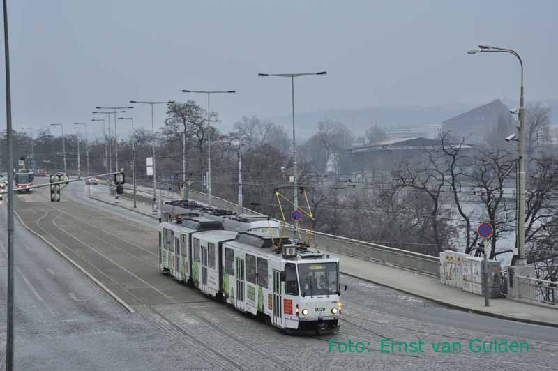 De 9039 is een van de laatste KT8-wagens in Praag in de originele uitvoering. Hier rijdt deze wagen op de Nabrezi Kapitana Jarose op 17 februari 2011. Foto: Ernst van Gulden.