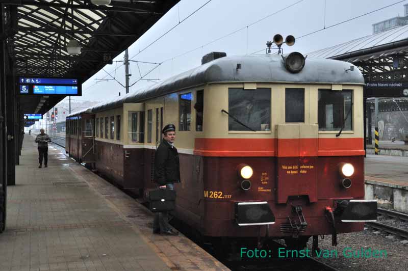 18 februari stond in het teken van een rondrit met een motorwagen van de reeks 831 (M262.1117) van de KŽC. Hier staat de motorwagen gereed voor vertrek op het Praagse Hoofdstation (Praha Hl.N.). Foto: Ernst van Gulden.