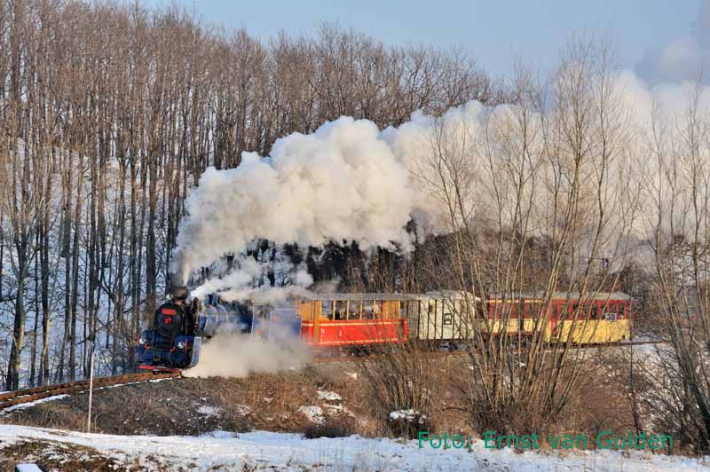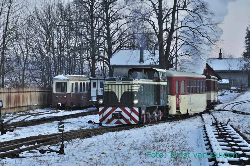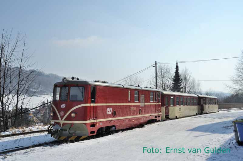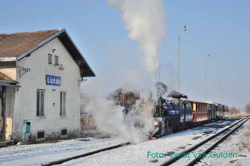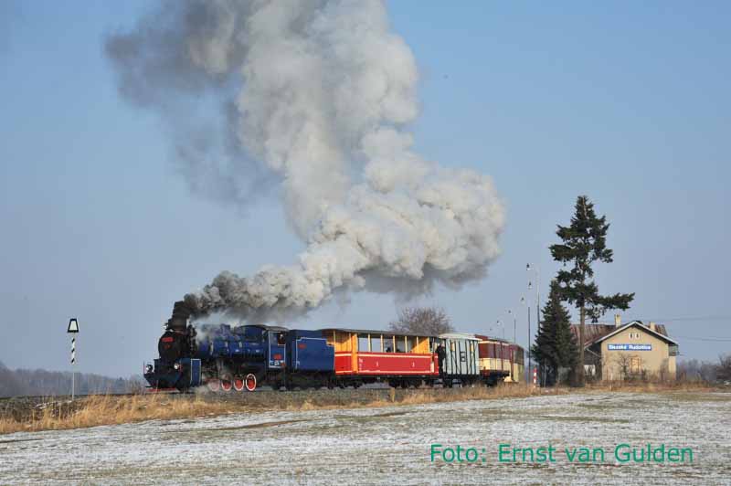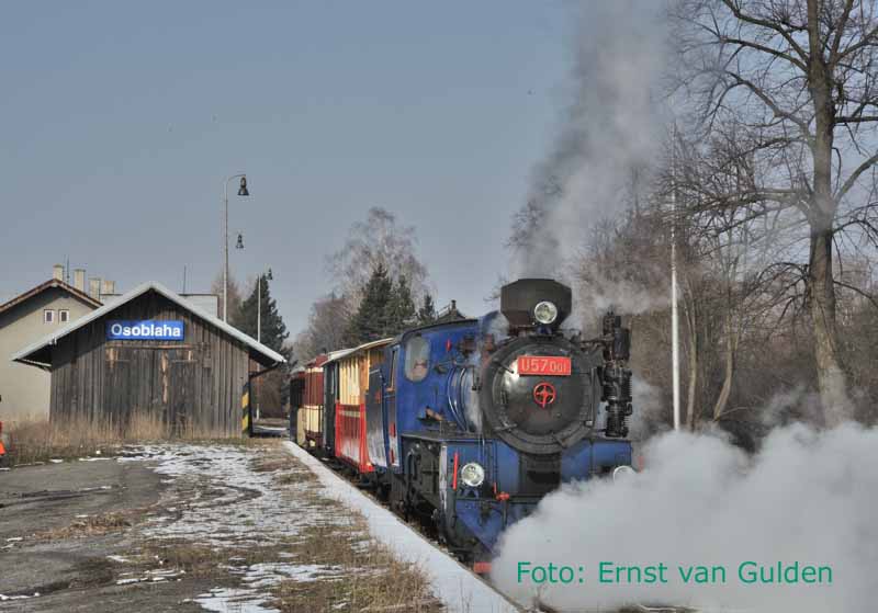 Een Winterreis zonder stoom is eigenlijk niet denkbaar. Daarom wordt vanuit Olomouc een excursie gemaakt naar de smalspoorlijn Třemešnáve Slezsku – Osoblaha, tegen de Poolse grens. De rit erheen en terug met een reguliere dieseltrein is trouwens ook een belevenis en landschappelijk schitterend. Op het smalspoor worden we enthousiast ontvangen en reizen we eerst met de gewone diensttrein naar Osoblaha, waartoe deze tot twee rijtuigen is verlengd. Aldaar staat de stoomloc gereed en vormt een eenvoudige warme lunch de opmaat voor de beproeving die ‘s middags volgt: de fotograferende deelnemers (de meesten dus…) worden voor de stoomrit geacht in een open rijtuig plaats te nemen! Ondanks de winterse kou doorstaat iedereen deze uitdaging echter en levert het sfeervolle opnamen op bij de vele stops langs de vrije baan of op idyllische stationnetjes.