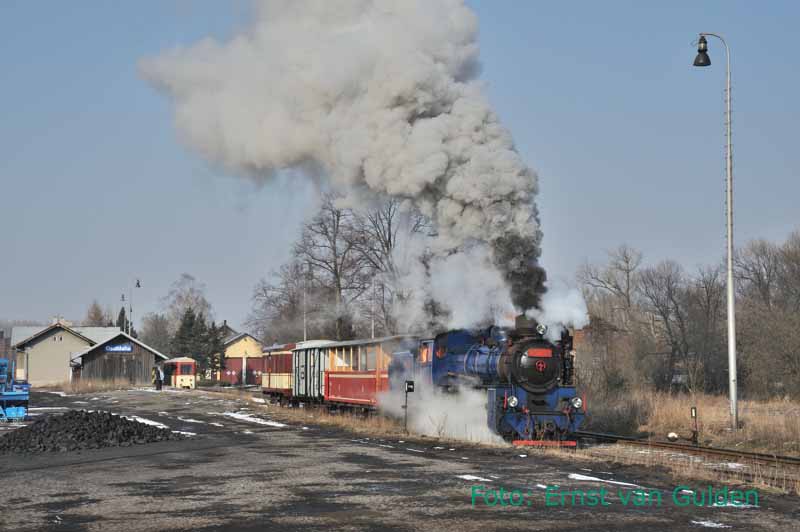 Na het vertrek van de reguliere diensttrein werd de stoomloc voor onze trein gezet. Osoblaha, 24 februari 2011. Foto: Ernst van Gulden.