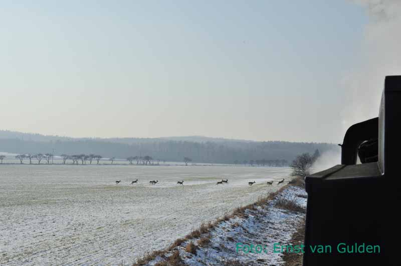 Een op hol geslagen roedel herten probeert voor de trein langs een veilig heenkomen te zoeken. Slezske Rudoltice, 24 februari 2011. Foto: Ernst van Gulden.