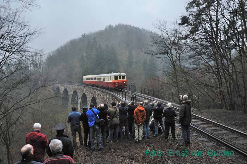Een nog veel mooier ijzeren viaduct passeren we later als we met de Ferkeltaxe de rit vanuit Cranzahl voortzetten. Na een interessante stop op het langzaam in een museumstation veranderende Schlettau bereiken we Markersbach, waar de laagstaande zon het mooiste licht laat schijnen op het grote viaduct en alle tijd wordt genomen het rode treintje helemaal terug te laten rijden ten behoeve van de fotografen. Zeer voldaan leggen we het bochtige traject naar Zwickau af, om ten slotte bij invallende duisternis met 90 km/u over de hoofdlijn naar Chemnitz terug te rollen. In het hotel wacht ‘s avonds het afscheidsdiner, dat gepaard gaat met lovende toespraken van enkele deelnemers.